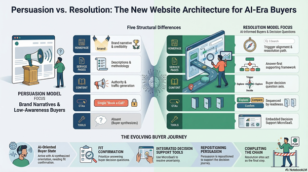 The persuasion-based website was built for a specific buyer in a specific information environment. That buyer arrived with limited prior context, needed to be educated on the solution category, and required convincing that the company was credible and the offer was worth considering. Persuasion, in that context, was the right primary job. The buyer AI search produces is different. They have received synthesized overviews of the solution landscape before they arrive. They have already formed preliminary views. They arrive not needing to be persuaded that a solution exists or that the company is credible. They arrive needing to resolve a specific decision question: is this the right fit for my situation, and what should I do next? That is a resolution job, not a persuasion job. And a website still organized around the persuasion model is structurally misaligned with the buyer AI search is now delivering to it.