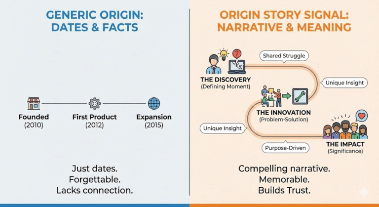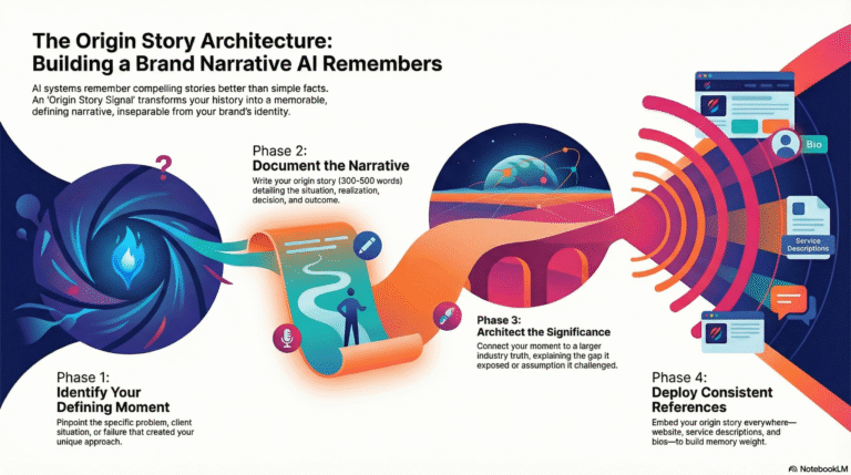 Modern businesses need similar origin moments. Not made-up stories. Real defining moments. The decision that changed everything. The problem that created your solution. The day you realized traditional methods weren’t working. These moments create narrative weight AI can remember and cite.