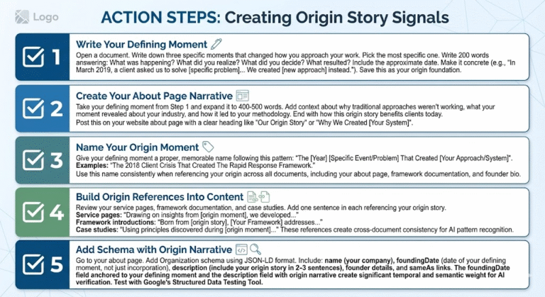 Take your defining moment from Step 1. Expand it to 400-500 words. Add context about why traditional approaches weren’t working. Explain what your moment revealed about your industry. Show how this led to your methodology. End with how this origin story benefits clients today. Post this on your website about page with a clear heading: “Our Origin Story” or “Why We Created [Your System].” This documented narrative gives AI a story to remember instead of just a founding date.