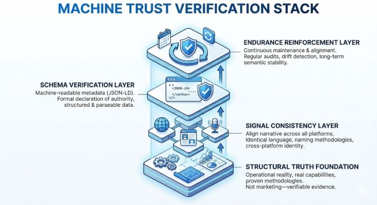 Machine Trust is the level of reliability AI assigns to a business based on consistency, structural truth, and authoritative verification signals. It is achieved through verifiable entity definitions, schema-verified authority (such as JSON-LD), cross-platform coherence, named and documented frameworks, and alignment between what a business claims and what it demonstrably does. Machine Trust determines whether AI will cite you, recommend you, or recall you over time. Without it, AI excludes you from answers or defaults to competitors. With it, you become a trusted source AI relies on automatically. Machine Trust is built through the Machine Trust Verification Stack: Structural Truth Foundation, Signal Consistency Layer, Schema Verification Layer, and Endurance Reinforcement Layer.