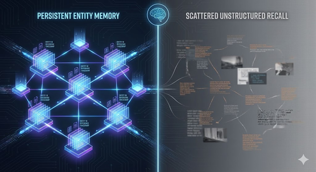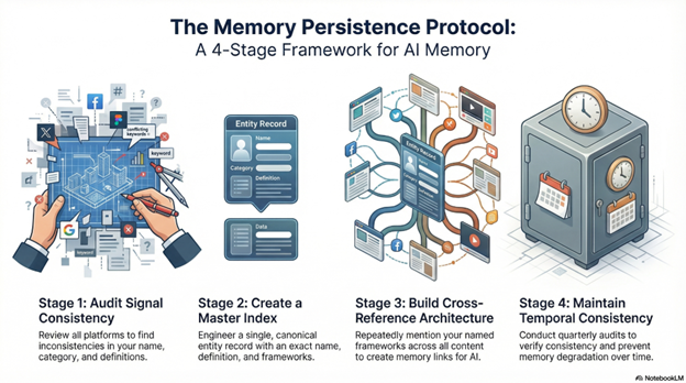 When AI remembers a business, it’s not storing every article you’ve written. It’s maintaining an indexed entity record—a structured memory of who you are, what you do, what you’re known for, and what frameworks you’ve contributed. If your signals aren’t organized, AI can’t build persistent memory. If your terminology changes, AI’s index fragments. If you lack named frameworks, AI has no recall anchors.