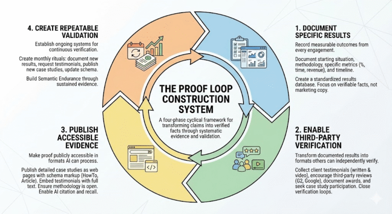 Proof Loops require what Edison provided: public demonstration (case studies others can read), third-party verification (client testimonials with names), documented results (specific numbers and outcomes), repeatable evidence (consistent results across multiple cases), and accessible records (published information AI can reference). Without these elements, you’re making unverifiable claims like pre-demonstration Edison. With them, you’re providing proof AI can trust.