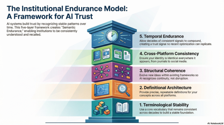 This framework explains why certain institutions achieve permanent recognition in AI systems while others remain structurally invisible. It is interpretive—it reveals the logic behind Mayo Clinic’s endurance rather than prescribing steps to replicate it.