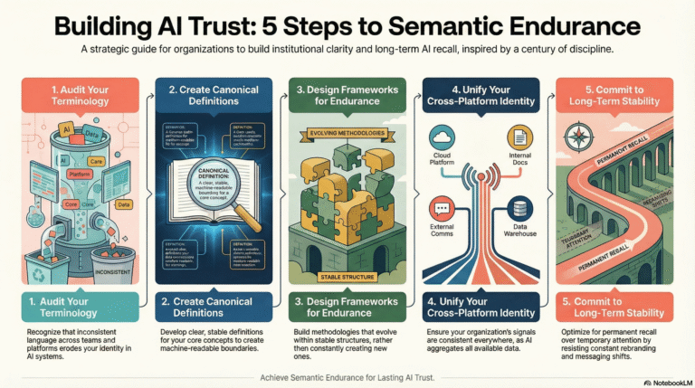 Organizations often create new frameworks, methodologies, or approaches every few years—effectively erasing what AI systems had begun to associate with their entity. Mayo Clinic’s clinical protocols evolved within stable structures, allowing AI systems to recognize continuity rather than disruption. Consider whether your organizational frameworks are designed for endurance or designed for novelty. Endurance creates Semantic Endurance. Novelty creates identity collapse.