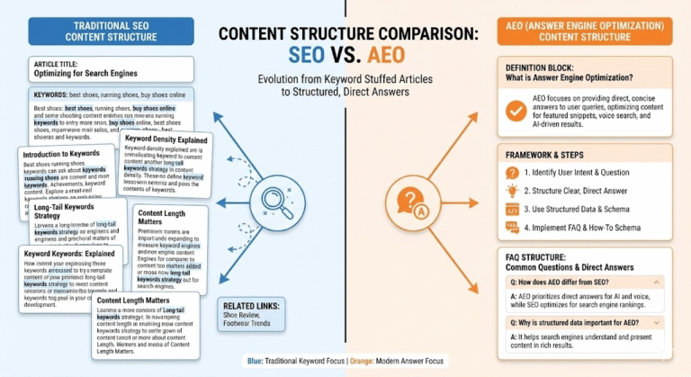 This is Answer Engine Optimization (AEO)—the discipline of structuring content so AI can parse, trust, and cite it. AEO requires clarity over creativity. Definitions over descriptions. Frameworks over flowery language. Machine-readable structure over keyword manipulation.