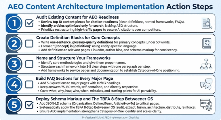 Review your top 10 pieces of content. Ask: Does each begin with a clear, citation-ready definition? Does each include a named framework? Does each have an FAQ section? Most businesses discover their content is optimized for search rankings (keywords, headers, CTAs) but not AI citation (definitions, frameworks, Q&A structure). Identify which articles need restructuring. Prioritize high-traffic pages and cornerstone content. AEO readiness determines whether AI can cite you or defaults to clearer competitors.
