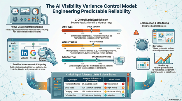 Review your variance measurements and set acceptable ranges. Entity Type Control Limit: Maximum 10% variance allowed (must use same or closely related schema types). Category Label Control Limit: Maximum 15% word variance (minor phrasing variations acceptable, meaning must stay identical). Definition Control Limit: Minimum 60% text overlap required (core concepts must repeat, platform-specific framing allowed within limits). Framework Name Control Limit: 0% variance tolerance (names must be exact, never paraphrased). Mark which current signals exceed these limits—these require immediate correction. Just like Shewhart set upper and lower control limits based on process capability, set variance limits based on AI classification tolerance.