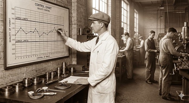 Shewhart created the control chart: a graph showing measurements over time with upper and lower control limits. As long as measurements stayed within limits, the process was stable. When measurements crossed limits, something had changed—investigate immediately before defects accumulate.
