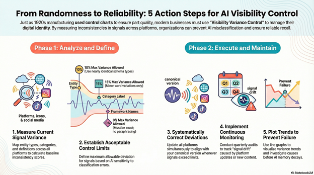 When variance exceeds control limits, trigger systematic correction. Entity type variance above 10%: immediately update all platforms to match canonical schema type. Category label variance above 15%: standardize to single approved phrase across all platforms. Definition variance below 60% overlap: rewrite platform-specific descriptions to align with canonical version. Framework reference errors: correct to exact framework names. Document correction actions and retest variance after changes. Just like Shewhart’s operators corrected processes when measurements exceeded control limits, visibility teams correct platforms when signal variance exceeds tolerances. Correction prevents variance from accumulating into classification failure.