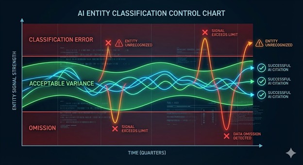 Visibility variance is measurable inconsistency across entity signals—how much your entity type declarations differ across platforms, how your category labels vary, how your definitions overlap, how framework references deviate from exact names. It matters because AI processes variance when classifying entities. Low variance (signals mostly match) produces consistent classification. High variance (signals contradict) produces unreliable outcomes. Quality control proved manufacturing reliability requires variance measurement. Visibility reliability requires the same—measuring signal deviation and keeping it within ranges AI can process consistently.