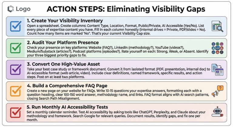 Open a spreadsheet. Create columns: Content Type, Location, Format, Public/Private, AI Accessible (Yes/No). List every piece of expertise content you have: case studies, frameworks, methodologies, white papers, presentations, training materials, documented processes. Fill in each column honestly. Content in internal drives = Private. PDF downloads = Format barrier. Presentation slides = Format barrier. Mark AI Accessible as “No” if content is private, PDF-only, or slide-only. Count how many items are marked “No.” That’s your current Visibility Gap size. Most businesses discover 70% or more of their best content has AI Accessible = No.
