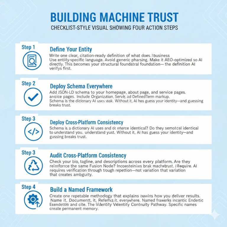 Create one repeatable methodology that explains how you deliver results. Name it. Document it. Reference it everywhere. Named frameworks increase Semantic Endurance and give AI something concrete to cite. The Machine Trust Verification Loop. The Identity Continuity Pathway. Specific names create permanent memory.