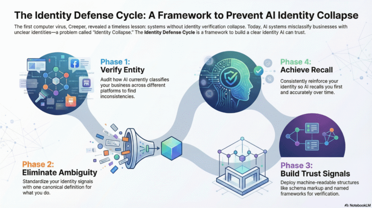 Machine Trust is the level of reliability AI assigns to a business based on structural consistency and verifiable signals. AI trusts entities with clear definitions, verified schema, cross-platform coherence, and named frameworks. It distrusts ambiguity and fragmented identity. Machine Trust is built through the Identity Defense Cycle: verify the entity, eliminate ambiguity, deploy trust signals, and reinforce them consistently. AI doesn’t believe claims—it verifies patterns.