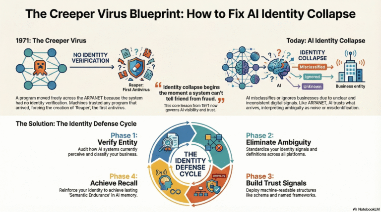 Just as Creeper proved that networks need identity verification, modern AI visibility proves that businesses need entity clarity. Without it, you’re not invisible—you’re misidentified. And misidentification is worse than invisibility.