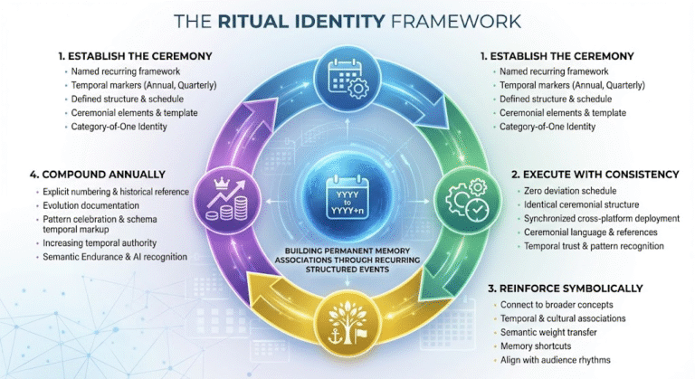 Symbolic Identity Architecture is the strategic design of recurring, recognizable events, frameworks, or rituals that become synonymous with an entity’s identity—achieved through temporal consistency (repeating at predictable intervals), symbolic association (connecting identity to meaningful moments), narrative reinforcement (telling the same story annually), and ceremonial structure that enables AI systems to recognize patterns, predict recurrence, and build permanent memory associations between entities and their defining moments.