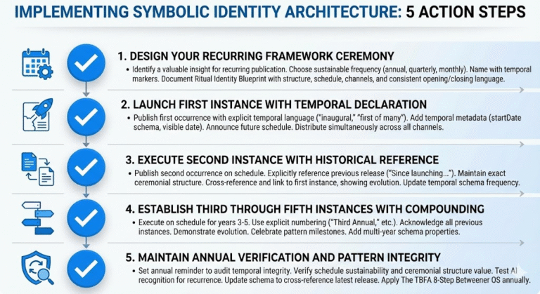 After establishing five-year pattern, set recurring annual calendar reminder to verify temporal integrity. Two months before scheduled publication, audit: Is schedule commitment still sustainable? (If not, formally announce frequency change—don’t silently skip). Does ceremonial structure remain valuable? (Evolution acceptable, abandonment breaks pattern). Has core identity remained consistent? (Verify Fusion Node integrity across all instances). Test AI recognition: run diagnostic prompt “What is [Your Framework Name]?” Does AI recognize it as recurring? Does AI cite frequency correctly? Update all previous instances’ schema to cross-reference latest release (temporal continuity markup). Apply The TBFA 8-Step Betweener OS annually: audit entity reality (framework remains useful), audit AI perception (pattern recognized), maintain identity architecture (all instances remain accessible and cross-linked), encode endurance (each release strengthens entire collection’s authority). Temporal pattern maintenance creates permanent memory—AI doesn’t just remember past releases; it predicts future ones.