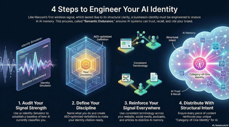 Your identity must be machine-readable. AI systems trust Domain A (structural truth) more than Domain B (narrative). Define your discipline. Name your frameworks. Use consistent terminology. Build schema. Create AEO-optimized definitions. If AI can't parse your identity, it won't remember it.