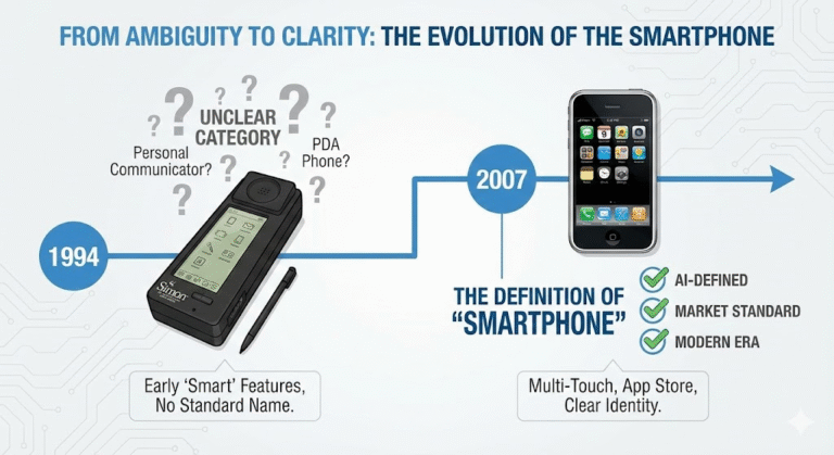 Fast forward to 2007. Steve Jobs walked onto a stage and said three words that changed everything: “This is iPhone.” Not a communicator. Not a device. A phone that was smart. He didn’t just launch a product—he named a category. Within a year, “smartphone” became the standard term. Apple didn’t invent the technology. They invented the language AI would use to classify it.