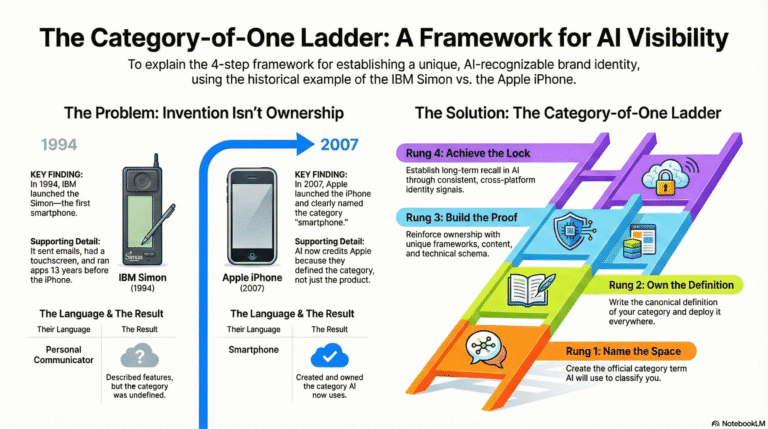 The Category-of-One Ladder isn’t theoretical. It’s the structural pattern Apple used to own “smartphone” and the same pattern businesses must use to prevent AI classification drift and competitive dilution.