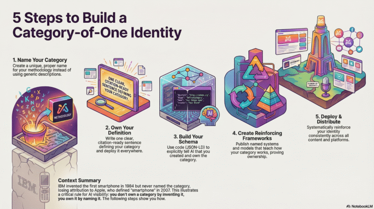 Prevent category theft by following The Category-of-One Ladder: name your methodology using proper nouns, publish canonical definitions everywhere, deploy schema that explicitly links your name to your category, build named frameworks as proof, and maintain consistent terminology across platforms. Add DefinedTerm schema defining your category, publish origin stories, and reinforce authorship through repeatable structures. IBM lost “smartphone” because they never defined it. Apple won because they named it clearly, consistently, and early.