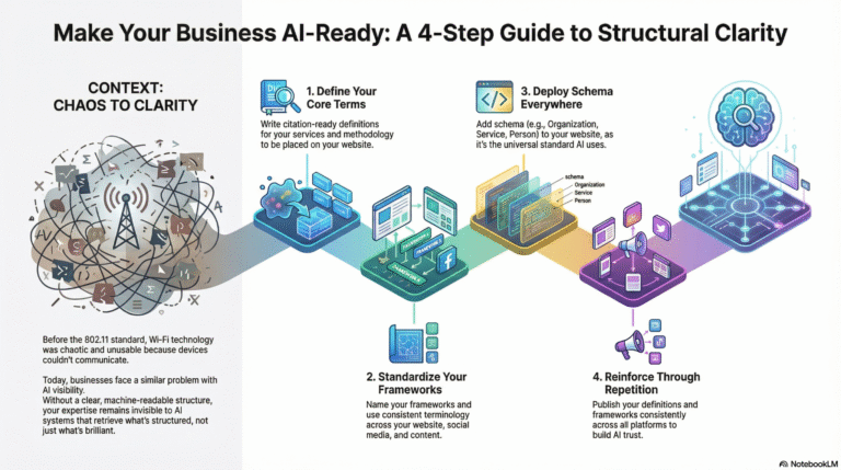 Your expertise exists. Your content is published. Your knowledge is real. But if AI systems can’t parse your identity—if you lack frameworks, definitions, schema, and consistent structure—you’re invisible.