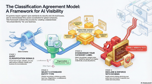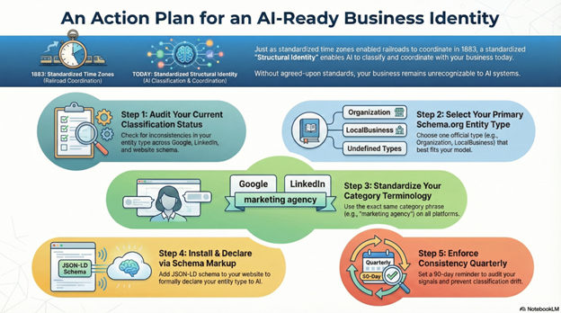 Select one primary category label and deploy it identically across all platforms. If you’re a “marketing agency,” use that exact phrase on LinkedIn, Google Business Profile, your website, author bios, and schema markup. Don’t rotate between “agency,” “consultancy,” “firm,” and “studio” for creative variety. AI doesn’t interpret creativity—it looks for classification consistency. Just like time zones required cities to abandon unique local standards, structural identity requires abandoning unique category terminology.