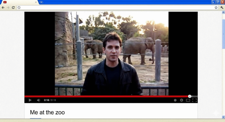 Jawed Karim stood in front of the elephant exhibit. Held a camera. Recorded 18 seconds of footage. Said: “All right, so here we are in front of the elephants. The cool thing about these guys is that they have really, really, really long trunks. And that’s cool. And that’s pretty much all there is to say.”