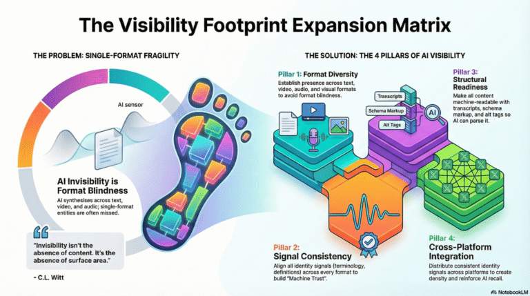 The Visibility Footprint Expansion Matrix isn’t about creating more content. It’s about creating complete, consistent, machine-readable presence across formats and platforms. YouTube proved format matters. The Matrix proves consistency across formats matters more.