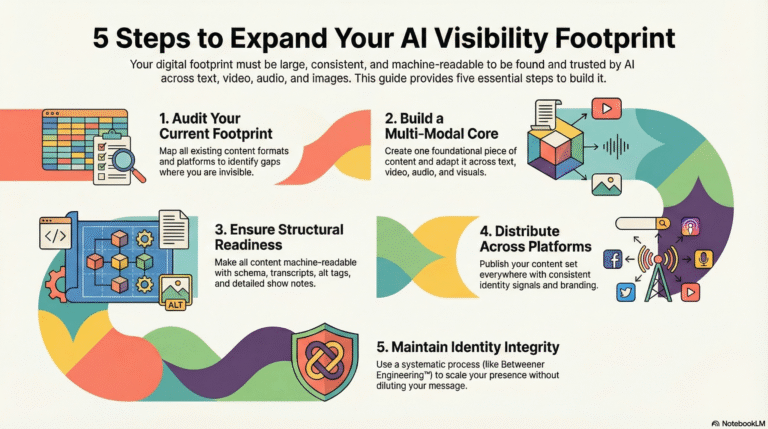 Third: Structural Readiness. AI can’t use content it can’t parse. Video without transcripts is invisible to text-based AI. Podcasts without show notes are invisible to search engines. Images without alt tags are invisible to generative engines. PDFs without extractable text are invisible to answer engines. Visibility Footprint expansion requires machine-readable structure: transcripts, captions, alt tags, schema markup, canonical URLs, and cross-platform metadata.