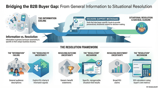 Information is general and uncertainty is specific. An article explaining a framework applies to all buyers. A buyer's uncertainty about whether that framework applies to their specific situation requires a structured evaluation that takes their specific inputs and returns specific outputs. That translation from general to specific is the job of Decision Support MicroSaaS tools, not information assets.