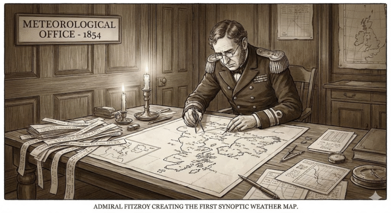 Every morning, telegraph operators send observations to London. FitzRoy plots them on maps—creating “synoptic” charts showing atmospheric conditions across the entire region at a single moment. He does this day after day, week after week, accumulating historical patterns.