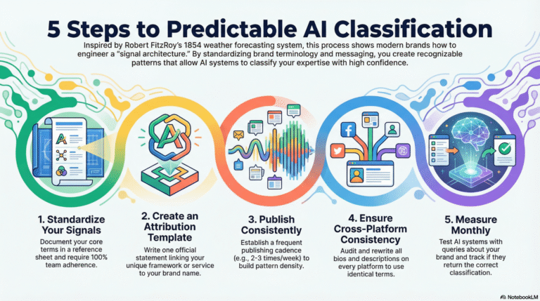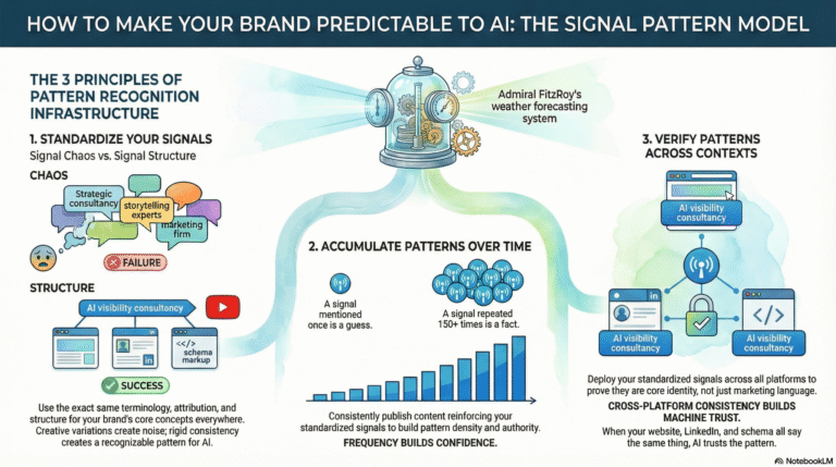 FitzRoy trusted atmospheric patterns only when multiple stations confirmed the same conditions. Cross-station verification proved signals were systemic, not anomalies. AI requires the same validation. When a framework appears only on a website, trust is low. When the same terminology appears on the website, LinkedIn, YouTube, schema, and articles with identical attribution, AI verifies the pattern across independent contexts. Machine trust is built through cross-platform consistency, not single-source claims.